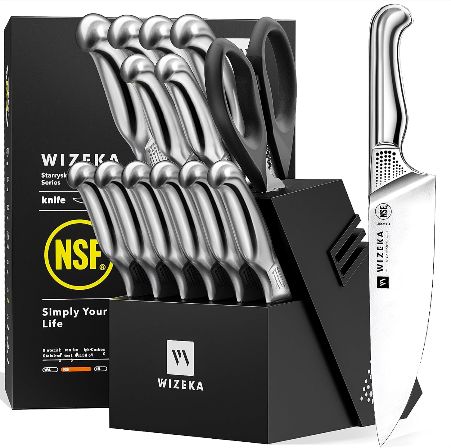 KD 15 Pcs High Carbon Stainless Steel Block Knife Set with Self Sharpening and 6 Steak Knives