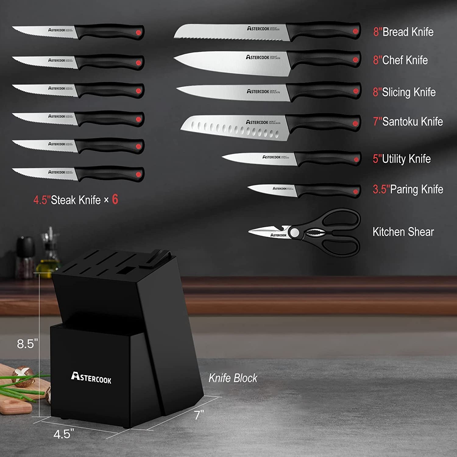 - This all-in-one value knife set includes 15 pieces. making it a versatile choice for various cooking tasks. The set includes an 8 chef knife. 8 slicing knife. 7 santoku knife. 8 serrated bread knife. 5 utility knife. 3.5 paring knife. 6pcs 4.5 serrated steak knife. 1 pair of kitchen shears. and a hard wood knife block with a built-in sharpener.