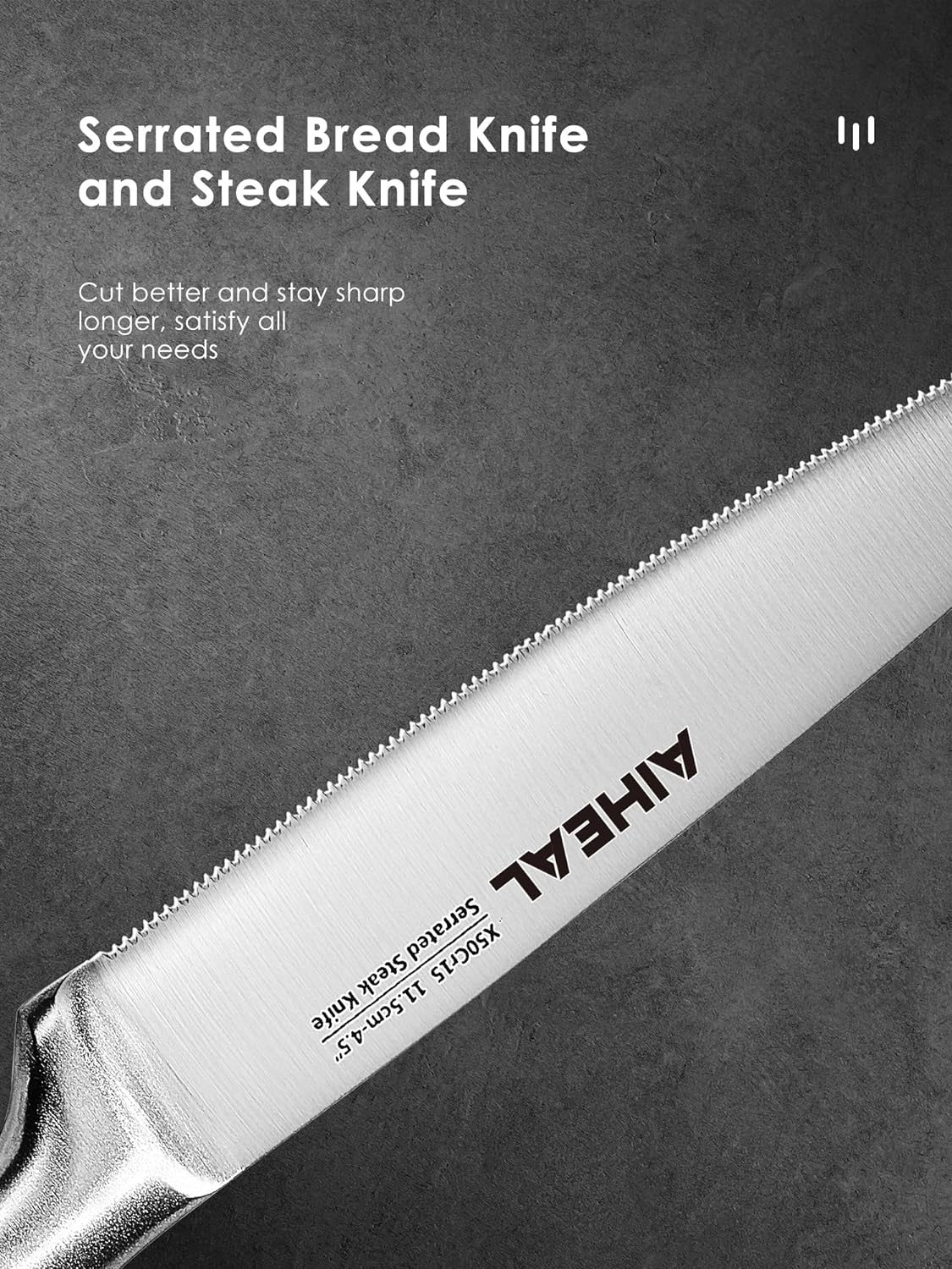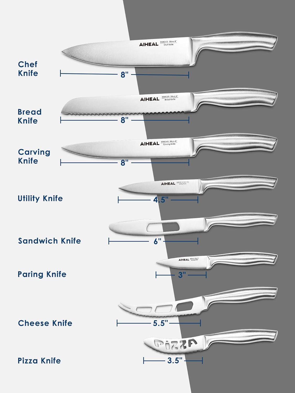 The knives in this set showcase an all-stainless steel blade. creating an eye-catching silver finish that is both unique and beautiful. Enjoy the elegance of a cohesive and visually appealing knife set.