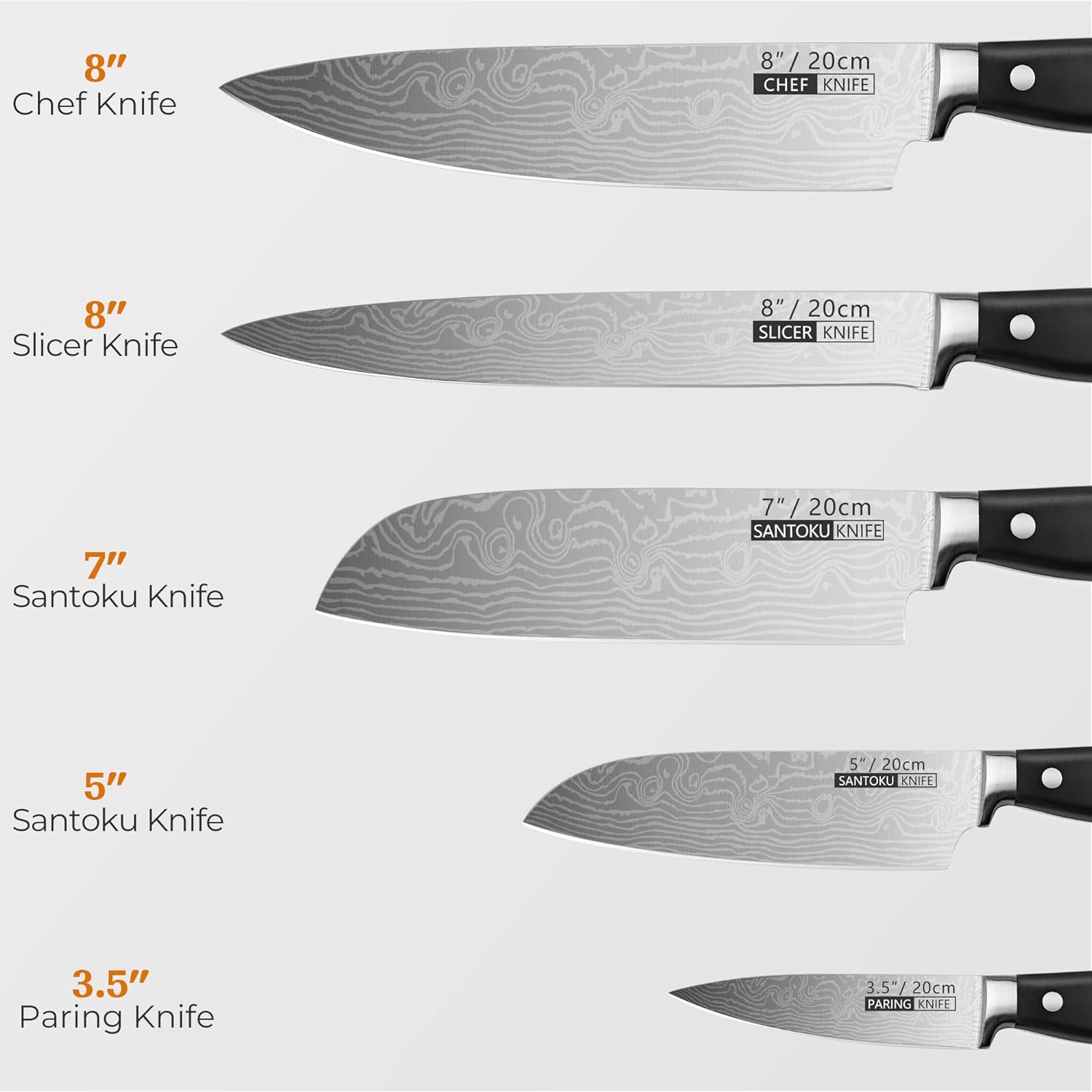 Exceptional 5-Piece Set: Unlock culinary excellence with our most valuable 5-piece set. featuring the Chef Knife. Slicer Knife. Santoku Knife. and Paring Knife. A classic ensemble for the everyday home cook. facilitating effortless cutting and chopping of meat. vegetables. fruits. and cheese.