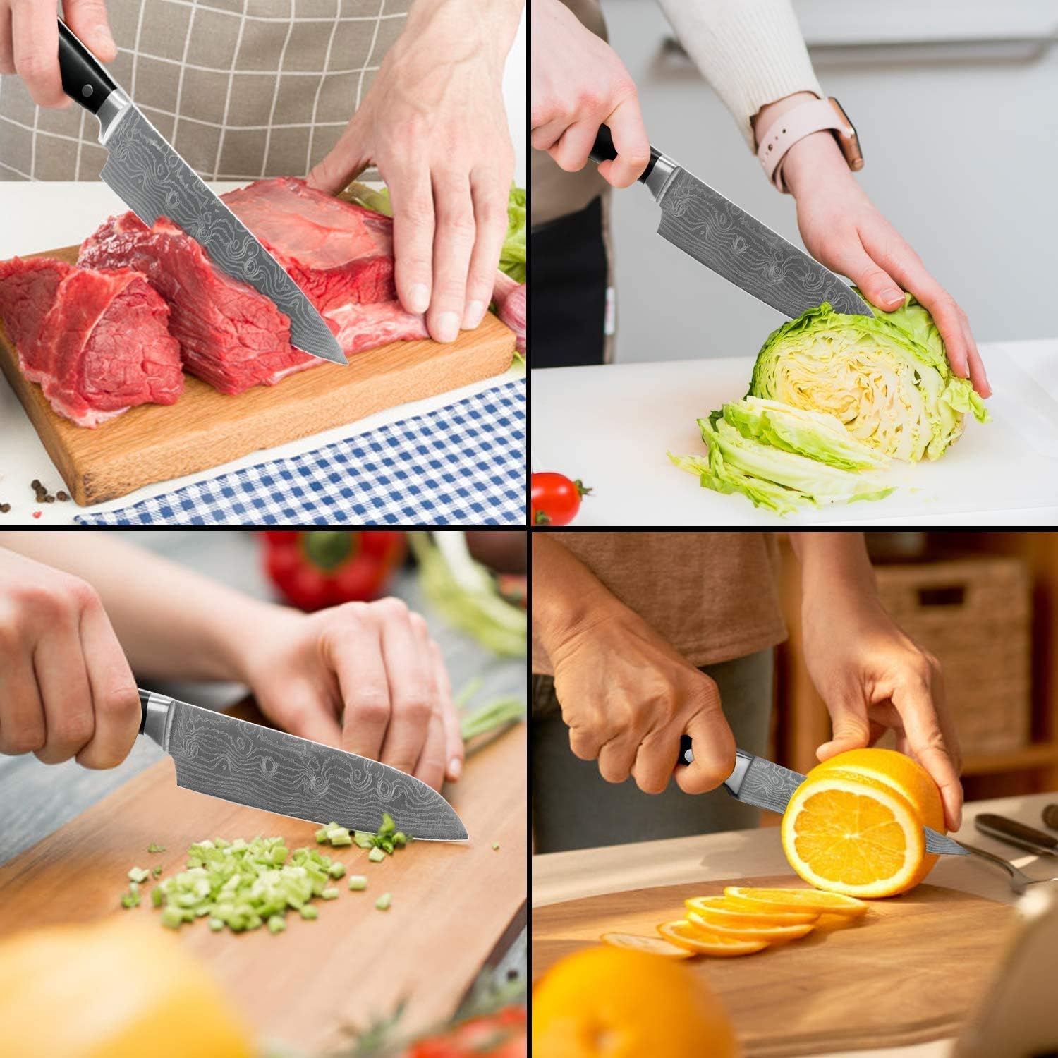 Ergonomic and Triple Riveted Handle: Forged from a single piece of high-carbon Japan stainless steel. each kitchen knife offers superior strength and durability. The ergonomic handle ensures a solid grip. while the triple-riveted design provides Japanese-level strength. The non-slip ABS handle maintains friction even when wet. ensuring safe and effortless cutting.
