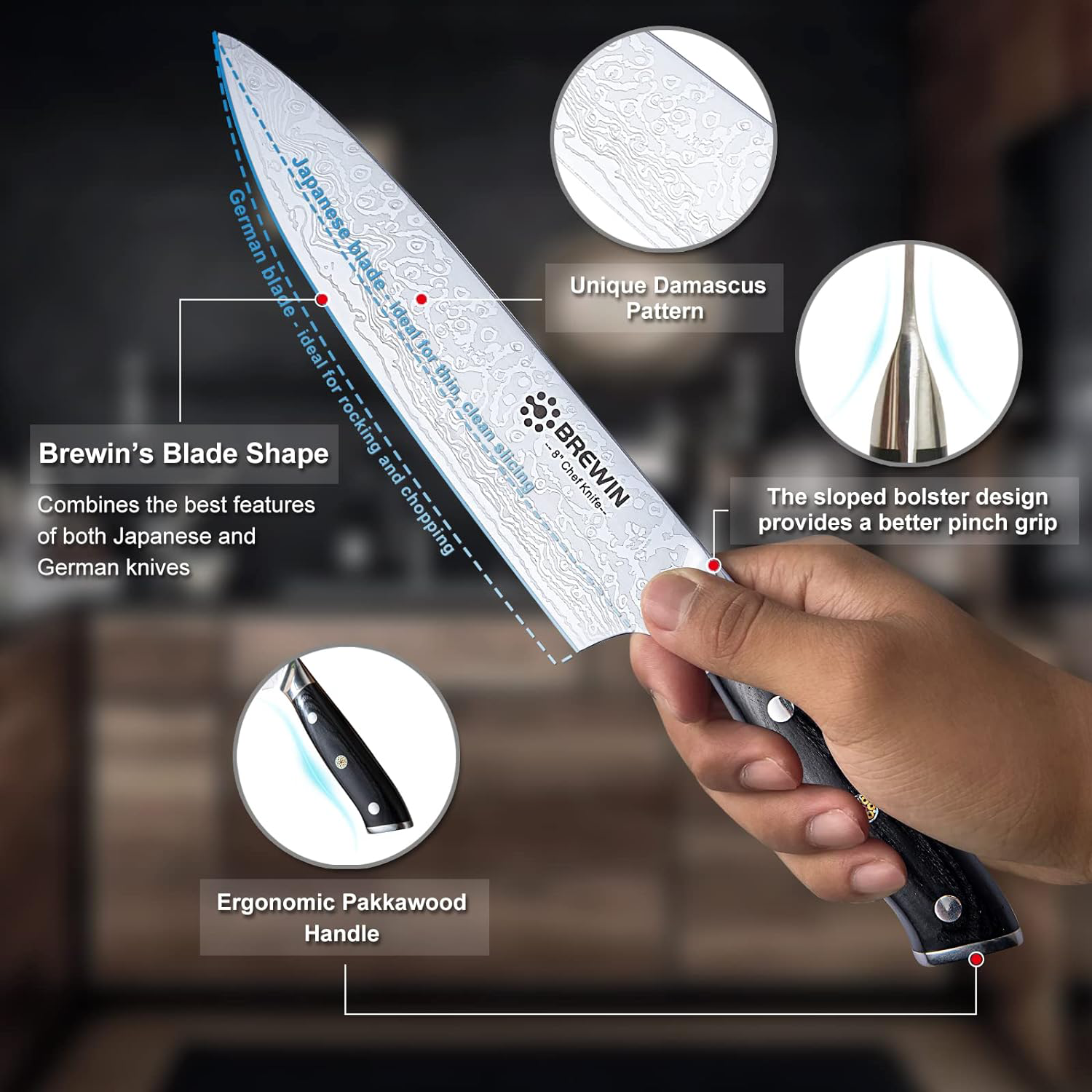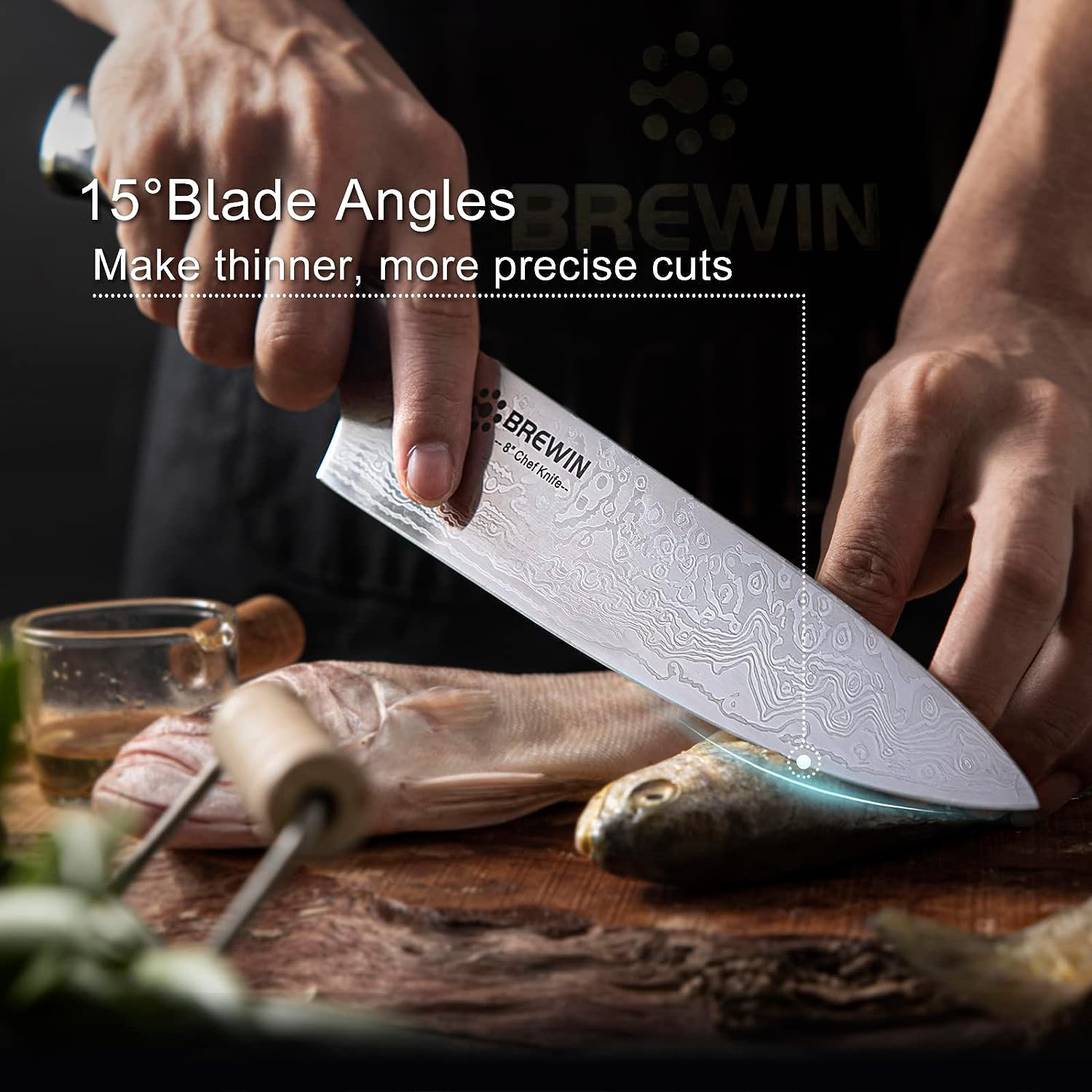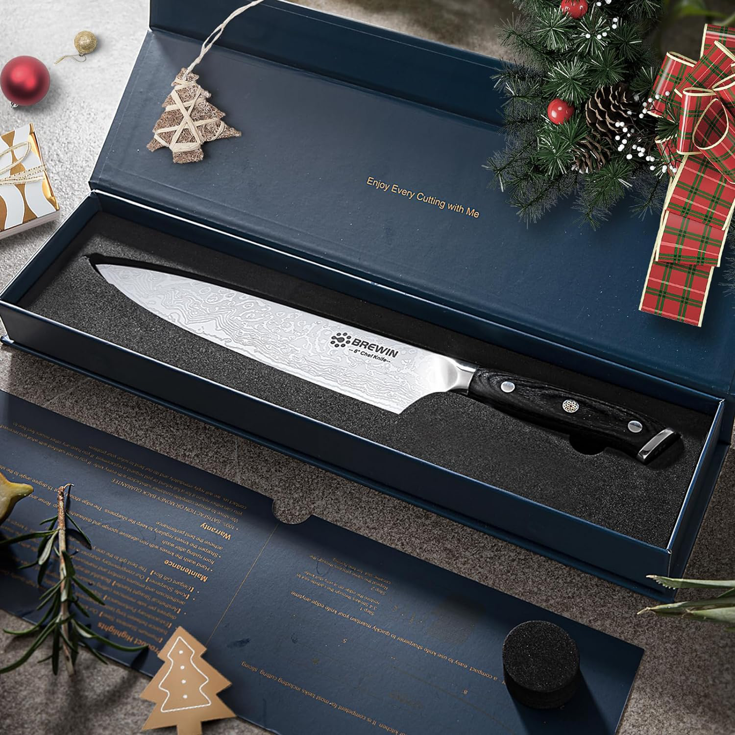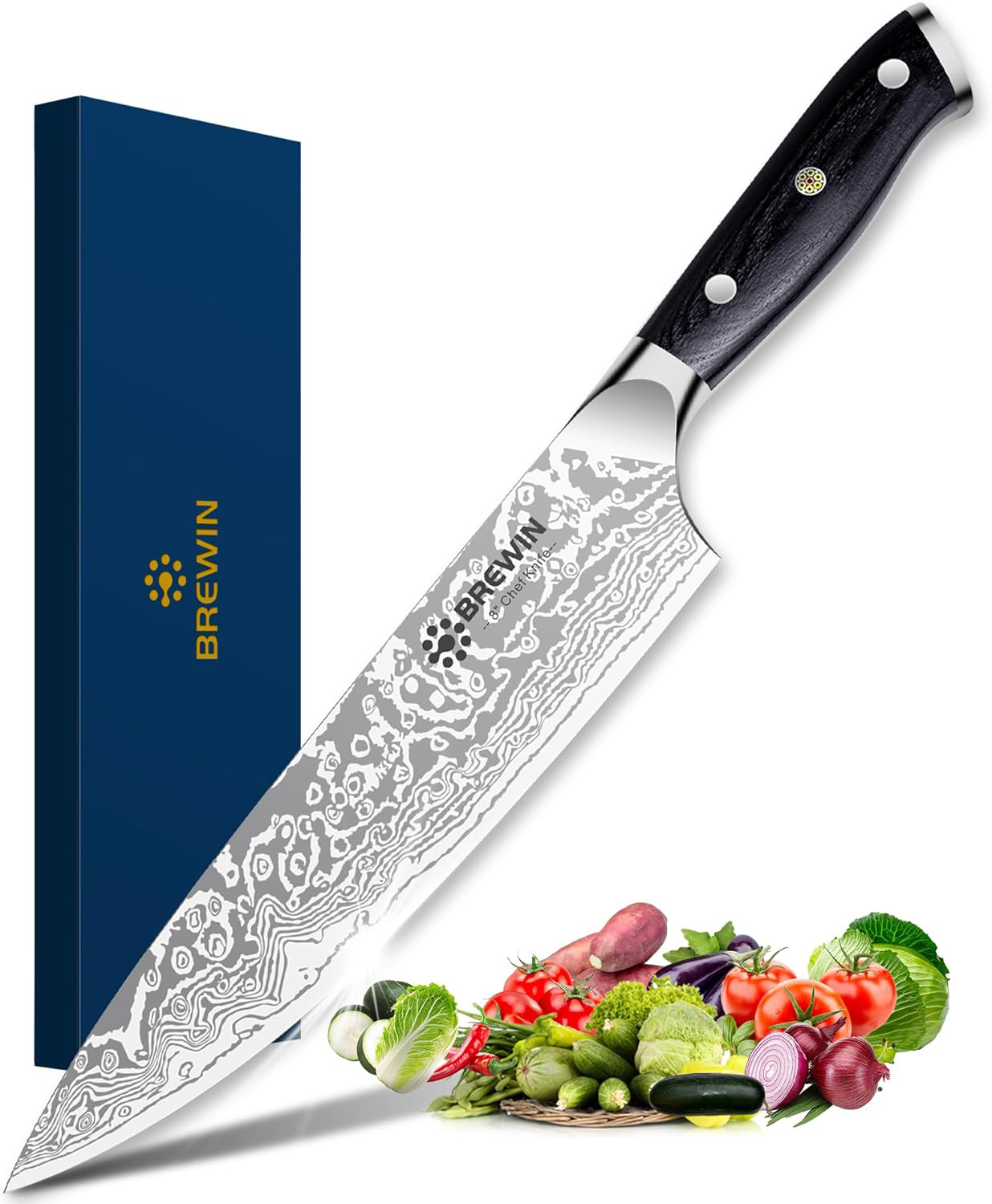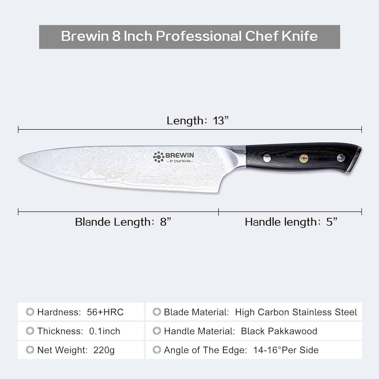 This 8 chef's knife is the perfect tool for precision cutting. Its full-tang design and pakkawood handle provide balance and strength. allowing you to effortlessly chop. dice. and mince. Its German stainless steel blade holds a sharp edge. ensuring your meals are always masterfully crafted.