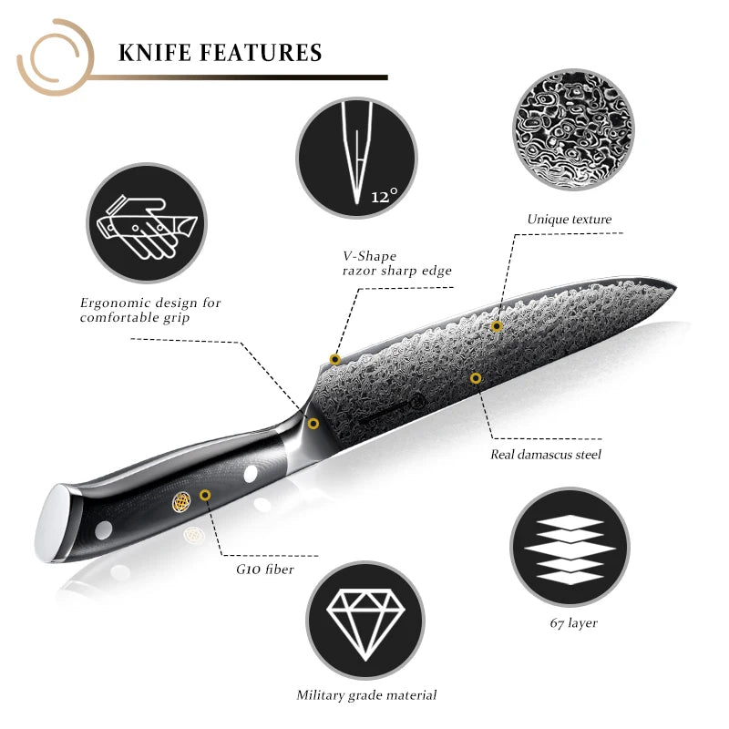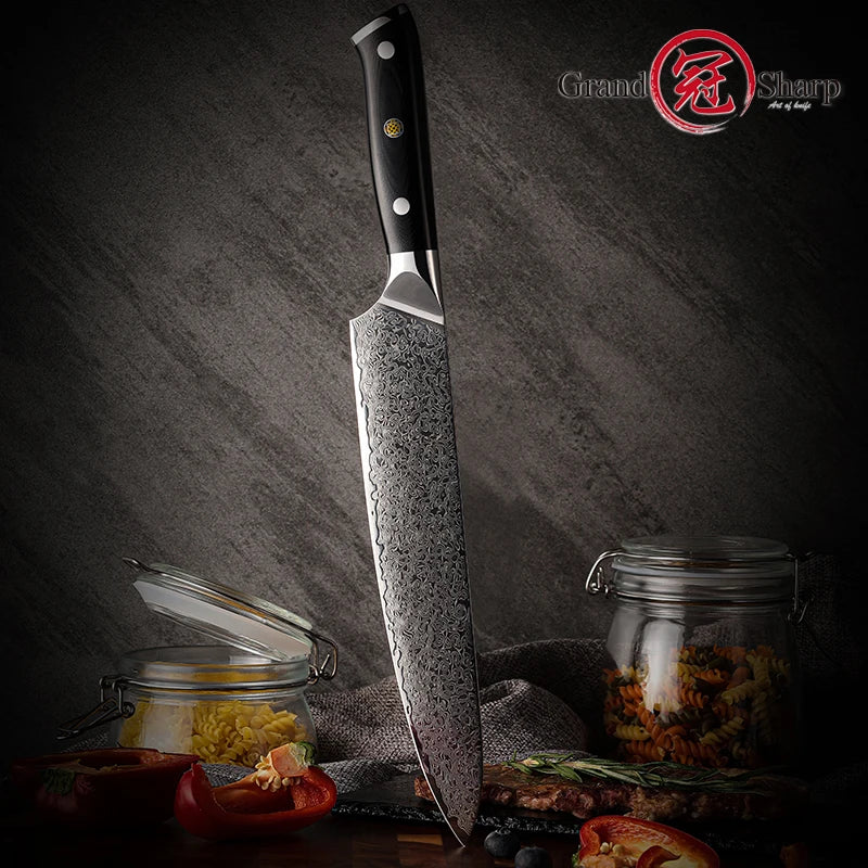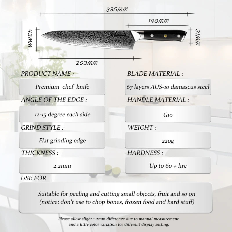 Product Specifications: Made with 67 Layers of Damascus Steel and a G10 Handle. this 9.5 inch Chef Knife boasts a 60 HRC Hardness and a Net Weight of 291g. Package includes a Knife Sheath and Gift Box.