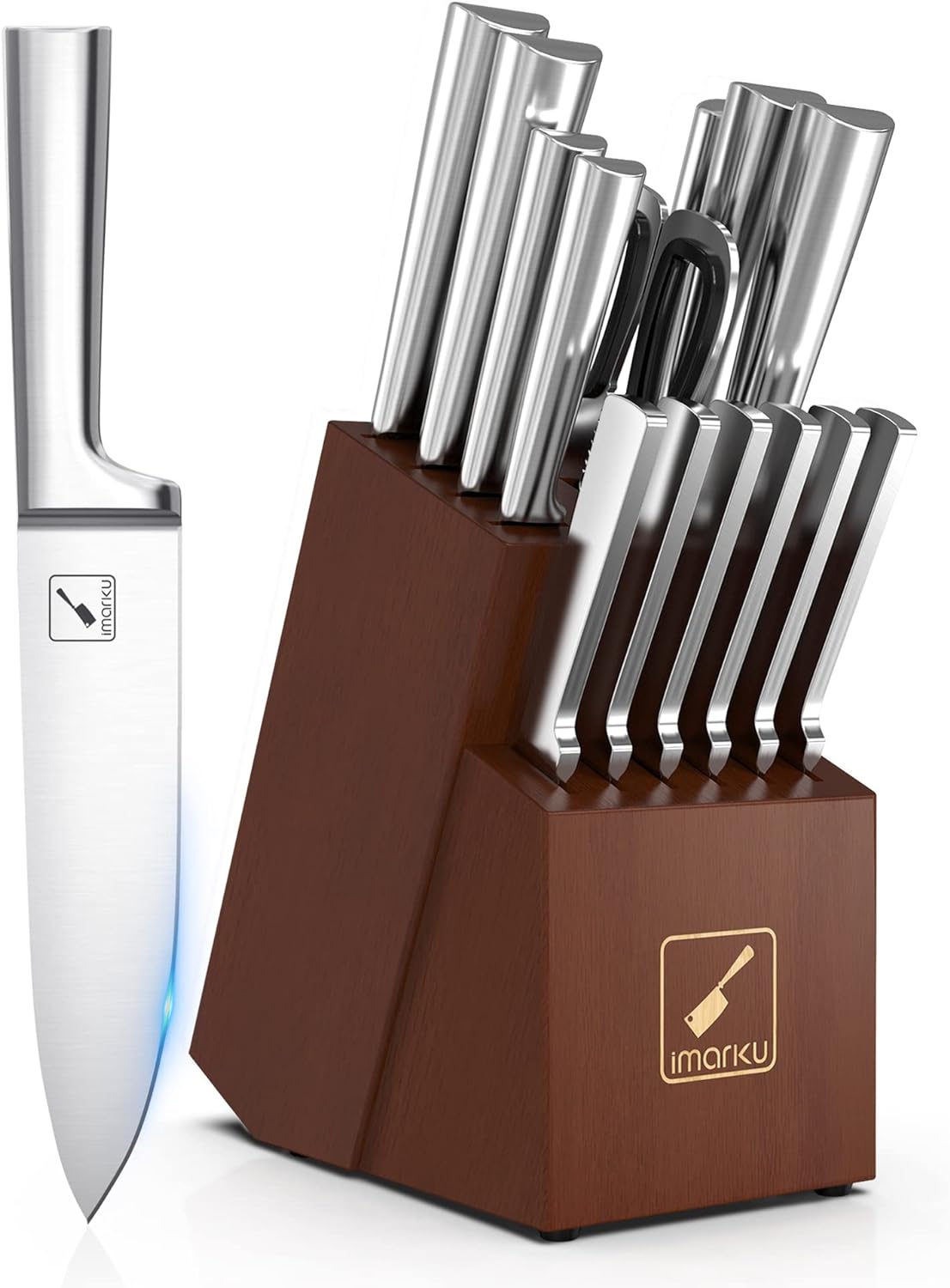 • This 15-piece knife set from imarku comes complete with a chef knife. santoku knife. bread knife. slicing knife. utility knife. paring knife. multi-purpose shears. and a set of 6 serrated steak knives. It is conveniently organized in a wooden knife block to save space and reduce clutter. This knife set is dishwasher safe. however hand-washing is recommended to maintain sharpness and longevity. After cleaning. make sure to dry the knives and store in a well-ventilated place.